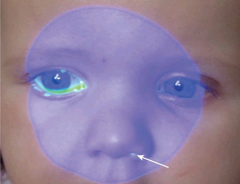 اس بچے کی بائیں آنکھ کی نالی بند ہے۔ ایک سبز رنگ کی دوائی ڈالی گئی جو بائیں طرف ناک سے باہر نکلتی ہوئی نظر آ رہی ہے جبکہ دائیں طرف وہ آنکھ میں ہی رہی اور آنکھ سے باہر نکل رہی ہے