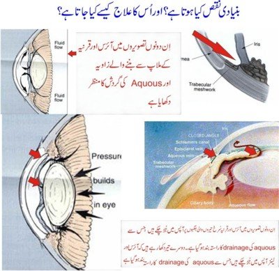 قرنیہ اور آئرس دونوں کے ملاپ جگہ پر ایک چھلنی سی بنی ہوتی جسے ٹرابیکولر نیٹورک Trabecular meshwork کہتے ہیں۔ اس جگہ پر وہ نظام موجود ہوتا ہے جس سے آنکھ سے مواد کی نکاسی ہوتی ہے۔ مختلف وجوہات کے باعث قرنیہ اور آئرس آپس میں اتنے زیادہ قریب آ جاتے ہیں کہ مواد Trabecular meshwork تک پہنچ ہی نہیں پاتا چنانچہ اس کے آنکھ کے اندر ہی اکٹھا ہوتے رہنے کی وجہ سے آنکھ کا دباؤ بہت زیادہ بڑھ جاتا ہے۔