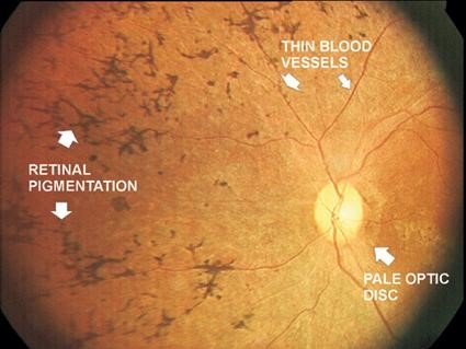 اِس بیماری میں پردۂ بصارت کا زیادہ تر حصہ بتدریج خراب ہوتا جاتا ہے اور کام کرنے کے قابل نہیں رہتا۔ یہ بیماری پردے کے مرکزی حصے کو عموماً متأثر نہیں کرتی۔ اگر کرے تو بیماری کی بہت آخری سٹیج پر جا کر کرتی ہے۔ پردے کے کناروں کی طرف سے خرابی شروع ہوتی ہے اور آہستہ آہستہ مرکزی حصے کی آتی ہے۔ نیچے کی تصویر میں آپ دیکھ سکتے ہیں کہ پردۂ بصارت خراب ہو رہا ہے: