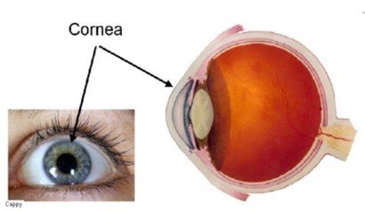 آ نکھ میں دو شفّاف محدّب عدسے ہوتے ہیں جِن کا کام شعاعوں کو آنکھ کے پردۂ بصارت پر مُنعکس کرنا ہوتا ہے۔ جو عدسہ سب سے باہر ہوتا ہے اُسے قرنیہ کہتے ہیں ۔سامنے سے دیکھنے سے آنکھ کا جو حصہ رنگدار ﴿براؤن، نیلا وغیرہ﴾ نظر آتا ہے اُسی کو قرنیہ کہتے ہیں البتّہ یہ رنگ قرنیہ کا نہیں ہوتا بلکہ قرنیہ کے پیچھے ایک پردہ ہوتا ہے جسے آئرس کہتے ہیں؛ اُس پردے کا رنگ ہوتا ہے۔ قرنیہ چونکہ بالکل شفّاف ہوتا ہے اِس لئے اِس کا اپنا کوئی رنگ نہیں ہوتا۔ جو بھی چیز اِس کے پیچھے ہو گی وہ نظر آئے گی۔ نیچے تصویر میں آنکھ کے مختلف حصے دکھائے گئے ہیں جن خاص طور پر قرنیہ نظر آ رہا ہے۔